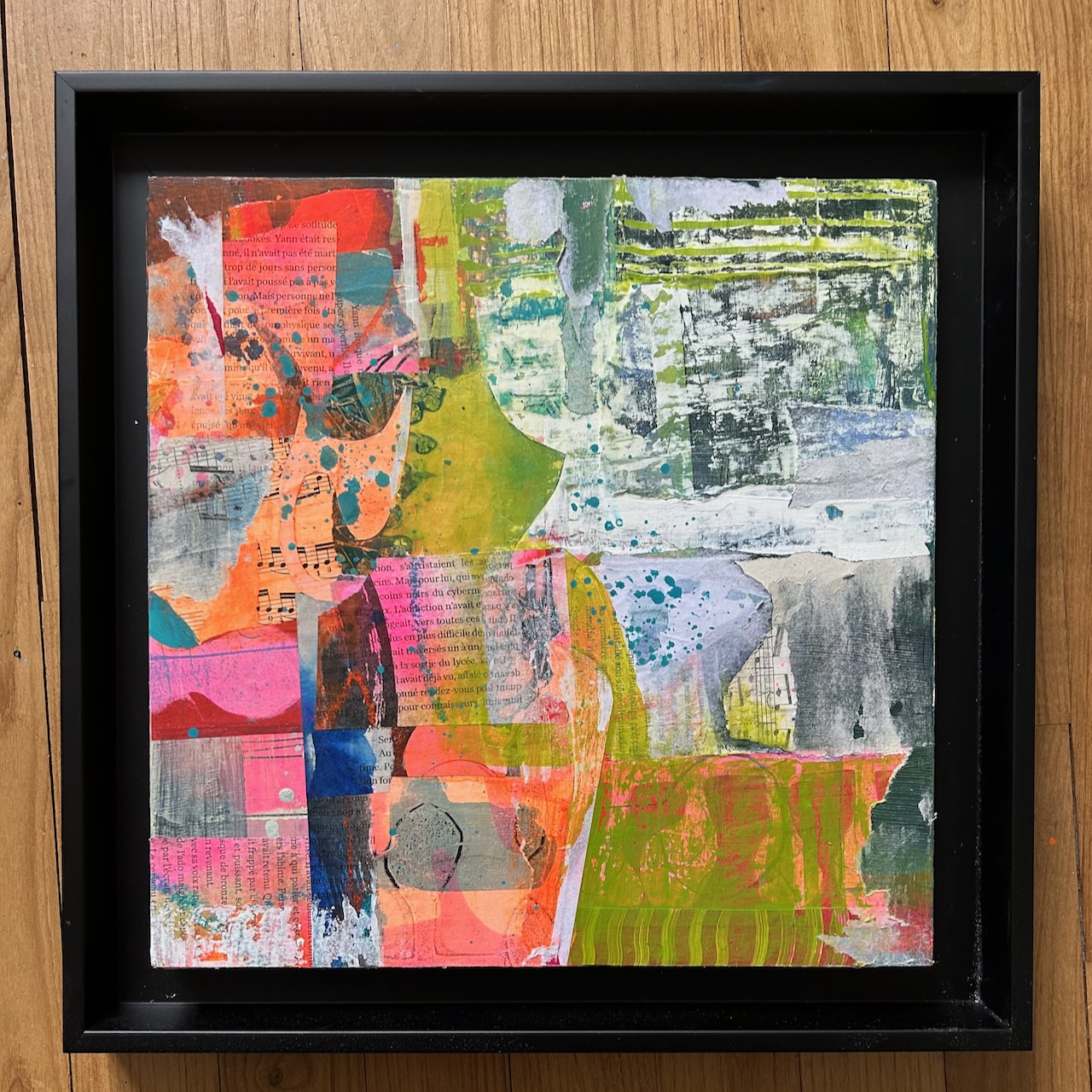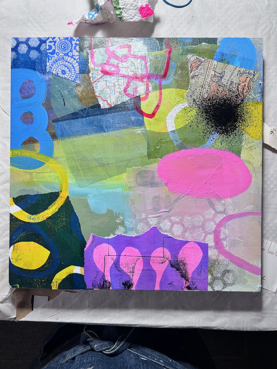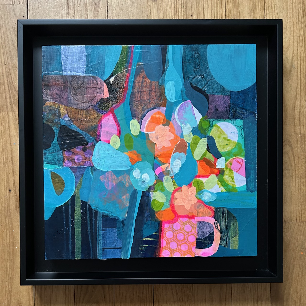 Souvent j’encourage les personnes qui suivent mes cours à jouer, à retrouver l’esprit du jeu. Mais jouer ça ne veut pas dire faire n’importe quoi. Jouer, c’est accepter de perdre le contrôle tout en restant attentive ou attentif. C’est un peu comme danser : on a une intention, une direction mais on se laisse aussi porter par le mouvement. Jj’ai repris ma palette de couleurs. des couleurs vives, fluo, très gaies. Des formes ont émergé : nouvelles, différentes, pas forcément comme je les avais imaginées initialement mais comme elles voulaient naître. J’ai observé ce qui se passait sur le support, et j’ai réagi à ce qui se produisait. Et au final j’ai été surprise, par exemple, par ce bouquet qui est surgit sans que je m’y attende.