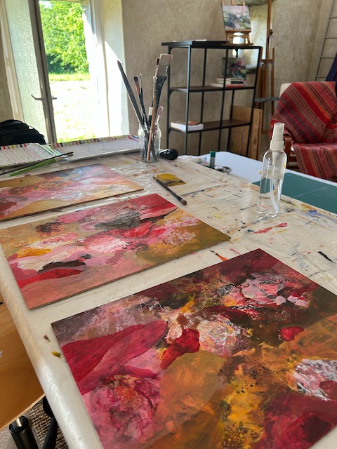 Demain est arrivé, et après mon premier café du matin, j'ai ouvert la porte de l'atelier. J'y avais laissé trois peintures reposer. Trois peintures sur lesquelles j'avais travaillées lors de mon séjour précédent, pendant quelques jours d'affilée, laissant mon inspiration artistique me guider.