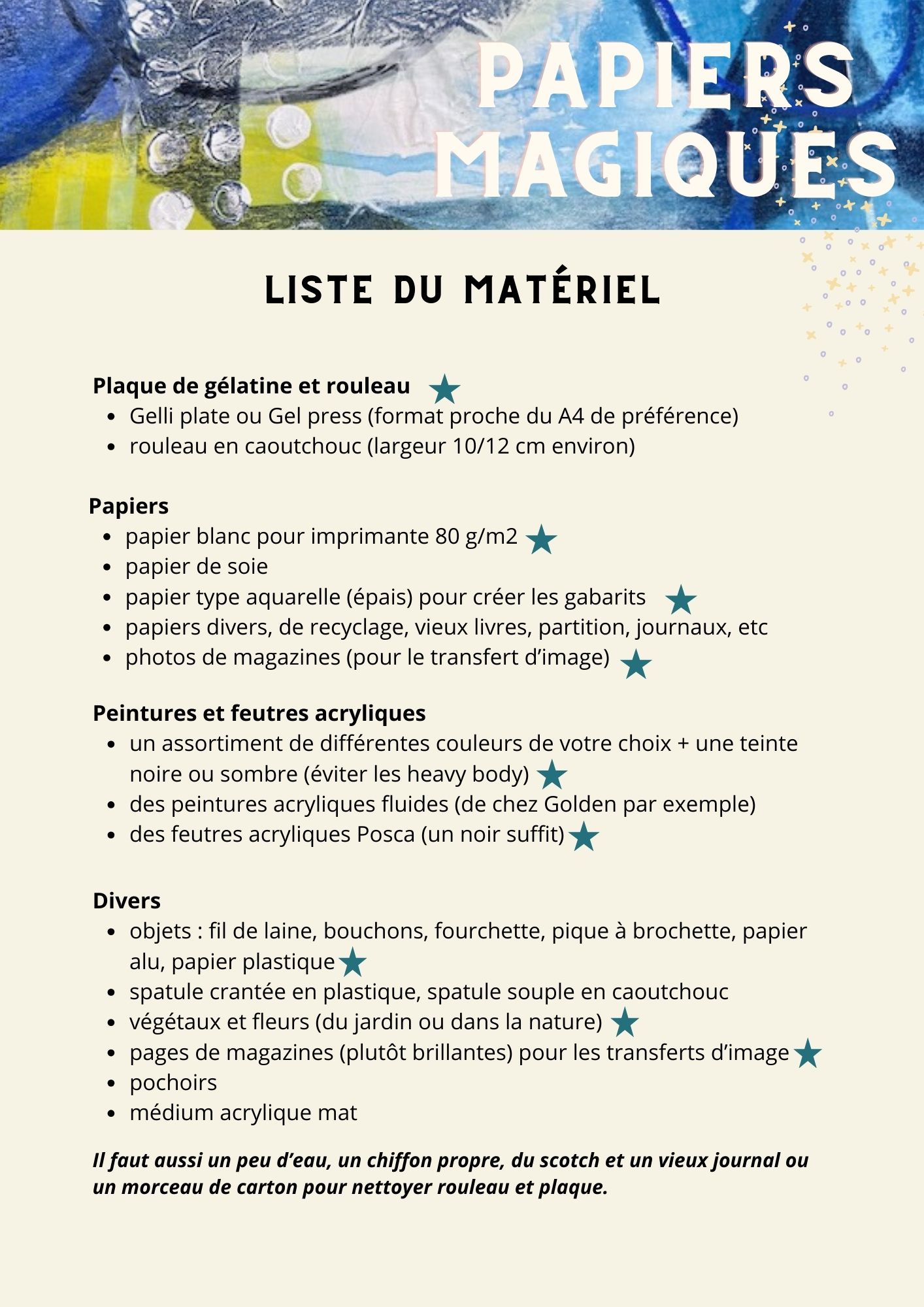 Certaines fournitures sont indispensables pour le bon déroulement du cours (plaque de gélatine, rouleau, peinture, etc). Elles sont marquées d'une étoile verte sur la liste. En général, je conseille aux stagiaires de jeter un coup d'œil à l'ensemble du cours, de faire avec ce qu'elles ont déjà et de voir ensuite s'il faut acheter du matériel supplémentaire.
