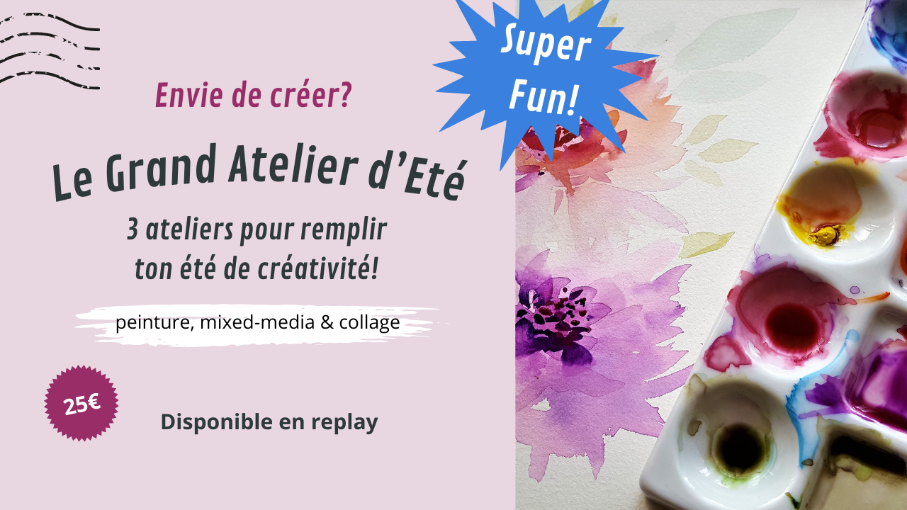 Il n'est pas trop tard! Découvre le Grand Atelier d'Eté en replay! Trois projets expliqués en direct, de A à Z, qui te permettront de trouver l'inspiration, d'apprendre à lâcher prise et à aller vers l'abstraction. Un concentré de création pour bien commencer l'été! 🤗